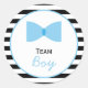 Schwarz-weiß gestreiftes Geschlecht zeigt Babyduschkleber. Das Design besteht aus einem schwarz-weiß gestreiften Muster und einem Kreis mit einer blauen Bogen-Krawatte und Ihrem Text.