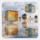 Reflektierende Würfel und Kugeln schweben über einer ruhigen Wasseroberfläche. Der Hintergrund zeigt einen hellen Himmel mit verstreuten Wolken und schafft eine surreale Atmosphäre.