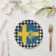 Teller: Rustikales Schweden Party Teller mit schwedischer Flagge umgeben von schwarz-weiß Büffel karierten Muster - Liebe mein Land, festliche Dekoration, nationale Patrioten / Sportfans