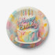 Ein lebhafter, pastellfarbener Geburtstagskuchen mit einer spielerischen Drehung, mit einem farbenfrohen " Happy Birthday " Zeichen und einem skurrilen Design, das sicherlich begeistern wird. Die Farbtöne Rosa, Blau und Gelb des Kuchens werden perfekt ergänzt durch den ausgeprägten Farbhintergrund und schaffen so eine unterhaltsame und lebendige Atmosphäre.