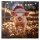 Keramik Kachel mit einem hübschen Schwein mit einer Weihnachtsmannmütze und umgeben von Weihnachtsblitz.