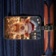 Gepäckanhänger mit einem hübschen Schwein, das eine Weihnachtsmannmütze trägt und von weihnachtlichen blinkenden Lichtern umgeben ist.