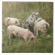 Diese phantastische Kachel zeigt ein schönes Foto einer Gruppe von niedlichen Schweinen auf einem Feld. Einige der Schweine rutschen auf der Erde herum, während andere auf sie schauen.