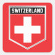 Die Nationalflagge der Schweiz ist in eine Schildform eingegossen, die auch das Set des Landesnamens über der Fahne hat.