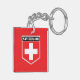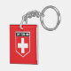 Die Nationalflagge der Schweiz ist in eine Schildform eingegossen, die auch das Set des Landesnamens über der Fahne hat.