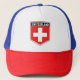 Die Nationalflagge der Schweiz ist in eine Schildform eingegossen, die auch das Set des Landesnamens über der Fahne hat.
