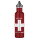 Die Schweiz fährt eine rote Wasserflasche mit Schweizer Flagge. Wasserflasche. Sie können den Namen leicht ändern.