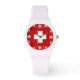 Mit dieser stilvollen Uhr unter der hellen und fröhlichen Schweizer Flagge mit ein paar stilisierten Edelweiß, einer der vielen alpinen Schweizer Blume, brauchen Sie sich keine Sorgen zu machen. Ob auf den Skipisten oder bei einem wohlverdienten Ausflug mit einem der köstlichen Schweizer Geschirr, die in den hübschen Schweizer Chalets/Restaurants angeboten werden, wird diese Uhr sicherlich ein paar beneidenswerte Kommentare anlocken!