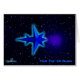 Ein einfaches, blau-farbenes 3D-Fraktal, das einem stilisierten Raumschiff ähnelt, das auf einem sternenförmigen Hintergrund überlagert ist. Konzentrische Ringe (Schwerkraft-Wellen?) gehen vom Raumschiff in das scheinbar leere Vakuum des Raumes aus. Eine hellblaue Aura umgibt die Raumsonde, vielleicht das Ergebnis schnellere als leichte Reisen.