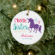 Schwesternbunte Unicorn-mittlere Schwester-personalisierte Weihnachtsverzierung. Personifizieren Sie diese entzückende Verzierung mit Namen unter eine schöne lila Unicorn-Silhouette. Text liest die MITTLERE SCHWESTER mit hübschen Herzen und in kräuselnlinien unterstrichen. Text im Pink, Türkis mit den blauen und rosa Herzen und den gelben Akzenten. Zurück von der Verzierung mit hübschem Türkishintergrund und hat Platz für das Jahr. Themed Feiertagsverzierung des hübschen bunten Unicorn. Koordinate mit anderen Geschwistergeschenken. Einhorn-Weihnachtsandenken.