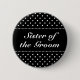 Niedliche Schwester des Bräutigam Pinback Knopf für Hochzeiten, Hochzeitsfeiern und Proben. Klassisches Schwarz-Weiß-Polka-Punktmuster-Design. Individualisierbarer eleganter Text und stilvolle Hintergrundfarbe.
