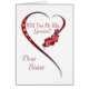 Einladung an Sister, ein Greeter zu sein. Eine wunderbare Einladung für Ihre Hochzeitsbegleiter. Sie werden diese Karte für immer schätze. Ein moderner Akzent auf einem traditionellen Thema zeigt ein wirbelndes Herz mit rote Rosen. Copyright Norma Cornes.