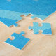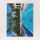 Puzzle. Ein unberührter Pool mit dekorativen Motiven am Boden ist von Liegestühlen und Palmen umgeben. Der klare blaue Himmel und die üppige Vegetation schaffen eine entspannende, tropische Atmosphäre.