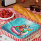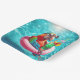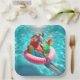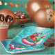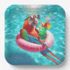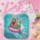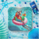 Ein Ara auf einem rosa aufblasbaren Ring in einem glitzernden blauen Pool mit Sonnenbrille und einem Cocktail
