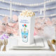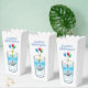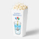 Pool Party Geburtstag Popcorn Gefälligkeitsbox mit einer niedlichen Abbildung eines kleinen Wals. Der Wal trägt einen rot-weiß gestreiften Hut und hat die Geburtstagsparty gestartet, die in einem gefüllten Wasserglas stattfindet.
