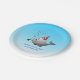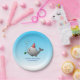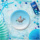 Pool Party Geburtstagszeitung Teller mit einer niedlichen Abbildung eines kleinen Wals. Der Wal trägt einen rot-weiß gestreiften Party Hut und hat die Geburtstagsparty im Schwimmbad gestartet.