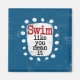 Ein niedliches typografisches Schwimmer-Design, das sagt "Swim Like You Gemein It". Er ist mit schwarzem und rotem Text auf einem weißen Rechteck mit funky, spielerisch weißen Punkten umgeben, die alle auf blauem Hintergrund dargestellt sind.