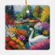 Das Bild zeigt einen weißen Schwan, der in einem Teich, umgeben von bunten Blume, schwimmt. Die Blume im Hintergrund sind in verschiedenen Rosa-, lila-, Gelb- und Grüntönen gehalten. Der Himmel ist blau und im Hintergrund sind Wolken. Die allgemeine Stimmung des Bildes ist friedlich und ruhig.