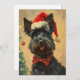 "Erleben Sie das festliche Ambiente mit unserem Weihnachtskartendesign mit einem bezaubernden schottischen Terrier, der eine charmante Weihnachtsmannmütze verbindet. Dieses liebenswerte Bild wird bestimmt das Herz wärmen und Ihren Feiertagsgruß mit Freude erfüllen."