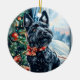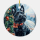 Mit diesem bezaubernden Ornament verleihen Sie Ihrem Weihnachtsbaum einen festlichen Flair, der einen charmanten schottischen Terrier mit einem Bogen trägt, der mit Schneeflocken dekoriert ist. Die schottischen Terrier liegen neben einem schön dekorierten Weihnachtsbaum mit funkelnden roten Bauern und fein eingewickelten Geschenken, mit einer schneebedeckten Winterlandschaft, die durch das Fenster zu sehen ist. Dieser Weihnachtsbaumschmuck vereint die Wärme und den Zauber der Weihnachtszeit und macht sie zu einer perfekten Ergänzung zu Ihrem Weihnachtsdekor. Ideal für Hundeliebhaber und vor allem Fans von Scottish Terriers, wird dieses Ornament jedem Baum festliche Freude bereiten.