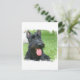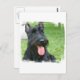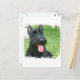 Schwarzer, schwarzer, schwarzer Hund mit Zunge, der auf der Postkarte hängt.