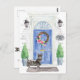 Mit unserer stilvollen Ankündigung kündigen Sie Ihre neue Adresse an: schottische Terrier, blaue Haustür, Begrüßungstafel, Schiefer-Schild, Topiaries und ein blumengeschmücktes Set auf grauem Backstein.