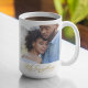 The Script Across Us mug features a centered full-width photo with a flowing cursive phrase My Everything overlaying the bottom. A delicate gold line with a heart accent adds warmth. The clean white base and modern layout create a sleek design that feels deeply heartfelt.