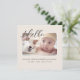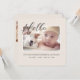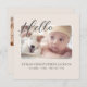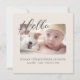 Script Baby Foto Moderne Geburtserklärung. Mehrwertige Geburtshilfekarte mit Platz für ein Baby-Foto auf der Vorderseite und zwei kleinere Fotos auf der Rückseite. Minimal modernes Design mit Skript Hallo auf der Vorderseite der Geburt Ankündigung.