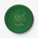 Elegante Skript-Schriftart-Klasse von 2025 Graduierungsparty Papier-Teller. In Gold, weiß und grün dargestellt. Ideal für Abschluss, Uni-Abschluß oder Abschlussfeier. Designs sind flache gedruckte Illustrationen/Grafiken - NICHT AKTUELLE GOLD FOIL.