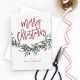 Eine festliche, rote, grüne und weiße Weihnachtskarte mit feinem Script und Aquarell mit Blätter und Beeren. Macht eine großartige persönliche oder geschäftliche Grußkarte für den Urlaub.