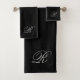Hübsches Script Monogram Initial Gray Black Bath Handtuch Set. Schwarzer Hintergrund mit anpassbarem Text für Monogramm, der zunächst grau geschrieben wurde. Alle Farben sind anpassbar. Wir laden Sie ein, unsere GJ Design Co zu besuchen, auf Zazzle zu speichern, um passende Produkte und mehr zu sehen.