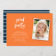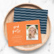 Stilvolle Foto-Abschlussfeier mit einem Foto in weißer Rahmen und "Grad Party" in trendiger Schrift vor orangefarbenem Hintergrund auf der Vorderseite und einem blau-weiß Streifen Muster auf der Rückseite. Personalisieren Sie es, indem Sie den Platzhalter-Text ersetzen und das Foto für die Auswahl/den Platzhalter durch Ihr eigenes Foto ersetzen. Für weitere Optionen, wie zum Beispiel den Schriftart zu ändern und ihn zu vergrößern oder zu verändern, klicken Sie auf den Button "Anpassen". *Bitte beachten Sie, dass das Zazzle-Wasserzeichen, das in der Zoomvorschau angezeigt wird, NICHT auf dem gedruckten Endprodukt erscheint. © Rosewood and Citrus
