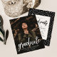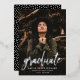 Einfache Graduiertenparty Einladung mit dem Foto des Absolventen mit "Absolvent" in real Rose Goldfolie-Skript. Personalisieren Sie die Front der Foto Graduation Party einladen, indem Sie den Namen, den Schulnamen und Abschluss Jahr des Absolventen. Die Einladung kehrt um, um Ihre Party-Details mit einem Muster von weißen Sprinklen mit einem schwarzen Hintergrund oder Farbe Ihrer Wahl.
