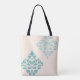 Scroll und Blattdämpfer wiederholen das Design in hellen und aquamarinen Details auf cremefarbenem Hintergrund.