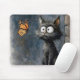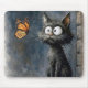 A curious, scruffy black cat gazes intently at a vibrant monarch butterfly against a backdrop of dark and muted colors of an alley