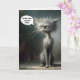 Eine skrupellose, langhaarige Katze mit auffälligen grünen Augen sitzt mit einem inquisitiven Ausdruck gegen eine mysteriöse Stadtbild-Kulisse für einen alten Geburtstag. Text kann geändert oder gelöscht werden.
