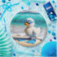 Ein flauschiges weißes Entlein steht an einem Sandstrand, der blaue Flossen und eine Tauchbrille trägt