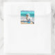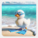 Ein flauschiges weißes Entlein steht an einem Sandstrand, der blaue Flossen und eine Tauchbrille trägt
