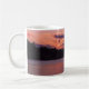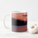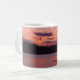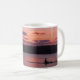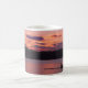 Eine Silhouette einer Person, die auf einem See am Sonnenuntergang sculling ist.