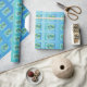 Dieses Verpackungspapier verblasst von blau grün bis tiefblau mit einem wiederholten Bild eines Rahmens mit einem Seepferd, der in grünen Algen mit Wasserblasen eingewickelt ist.