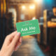 Helles Meer grüne "Frag Me" Abzeichen für Freiwillige, Lehrer, Doktoren, Führer, Veranstaltungsorganisatoren für besondere Veranstaltungen wie Hochzeiten, Kunsthandwerksmessen, Zuhause & Garden Shows, karitative Veranstaltungen, Business und Firmenveranstaltungen. Die Typografie ist ein blasses Elfenbein, das diesem Abzeichen ein modernes Aussehen verleiht.
