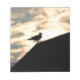 Ein Heringsmöwe sitzt auf einem Dach, das gegen einen weichen goldenen Abend-Himmel silbriert.