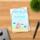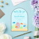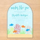 Babydusche mit orangefarbenen und blauen Fischen inmitten eines Sandriffs aus Korallen und Algen inmitten von Meeresblasen.