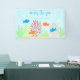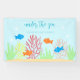 Babydusche mit orangefarbenen und blauen Fischen inmitten eines Sandriffs aus Korallen und Algen inmitten von Meeresblasen.