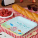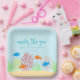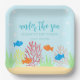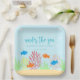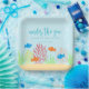 Babydusche mit orangefarbenen und blauen Fischen inmitten eines Sandriffs aus Korallen und Algen inmitten von Meeresblasen.