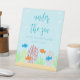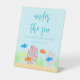 Babydusche mit orangefarbenen und blauen Fischen inmitten eines Sandriffs aus Korallen und Algen inmitten von Meeresblasen.