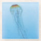 Ein Aquarellbild einer Qualle mit einem farbenfrohen Oberteil im großen, offenen, blauen Ozean. Copyright ©2017 Kimberly J Tilley.