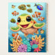 Sea Turtle Niedlich und Happy Baby Sea Animal Cartoon Charakter Schwimmen im Sommer Unterwasser, umgeben tropische Fische und Korallen Vektor Illustration Copyright BluedarkArt The ChameleonArt.