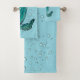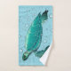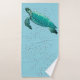 Badetuch-Set mit Schildkrötenbildern vor einem ozeanfarbenen Hintergrund mit Blasen.