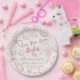 Sea you soon seashells beach girls baby shower monogrammed paper plates. Pink preppy seashells baby shower personalized paper plates, beach baby shower party plates, summer baby shower custom party plates, hand drawn doodle sketch seashells baby shower personalized table decor, hand writing vintage baby shower paper plates